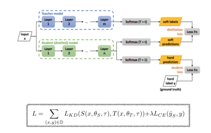 기존의 softmax output과 다른 점은 T라는 값이 분모로 들어가는데 논문에서는 온도(temperature)라고 표현하고 이 값이 높아지면 더 soft하게 되는 거고 낮아지면 hard하게 만드는 과정입니다. 이 soft targe은 큰 모델(Teacher)의 지식을 의미합니다. 이 모델을 학습을 시킨 후 작은 모델(Student)을 다음과 같은 loss 함수를 통해 학습시킵니다.